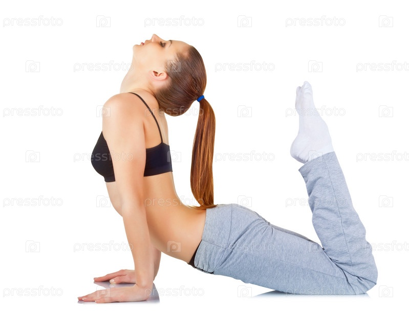 Молодая женщина занимается фитнесом на белом фоне