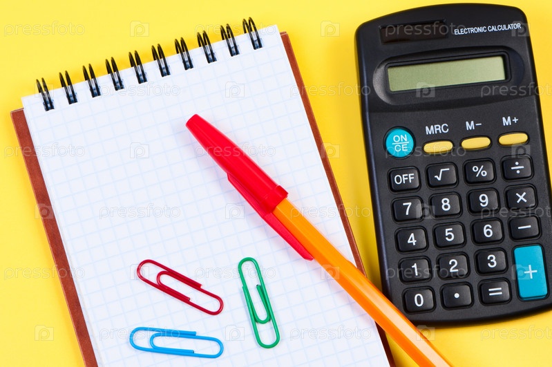 Блокнот, ручка, скрепки и калькулятор на желтом фоне