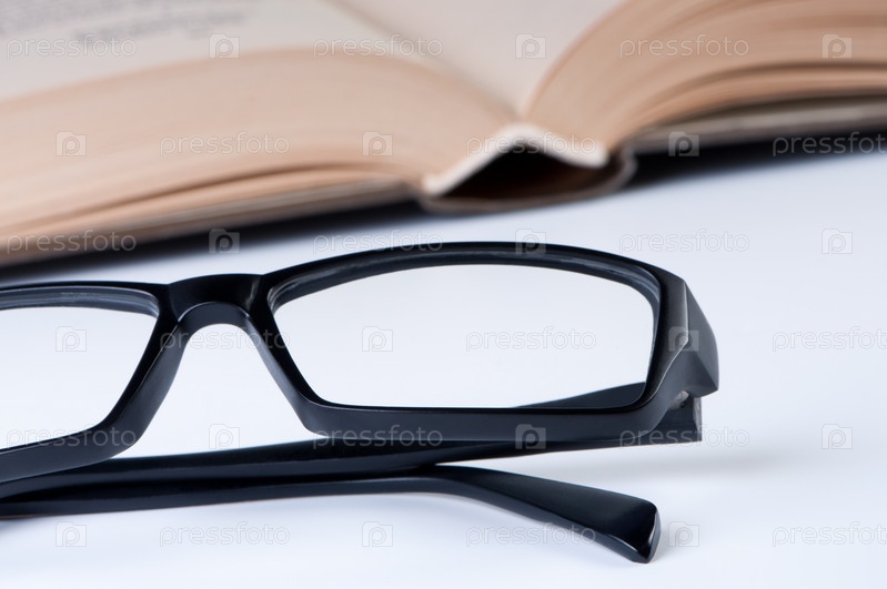 Книга и очки на белом фоне