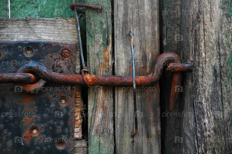 Старый грязный ржавый крюк и деревянные двери