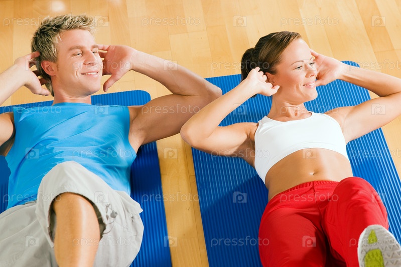 Девушка и парень качают пресс в спортзале