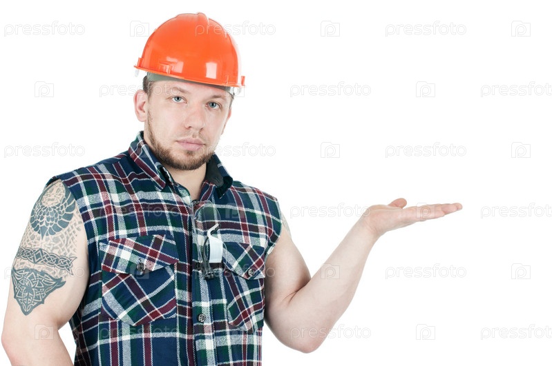 Строительный подрядчик в рабочей одежде показывает на место для текста, белый фон