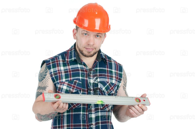 Мужчина-строитель в защитной каске с уровнем в руках, белый фон