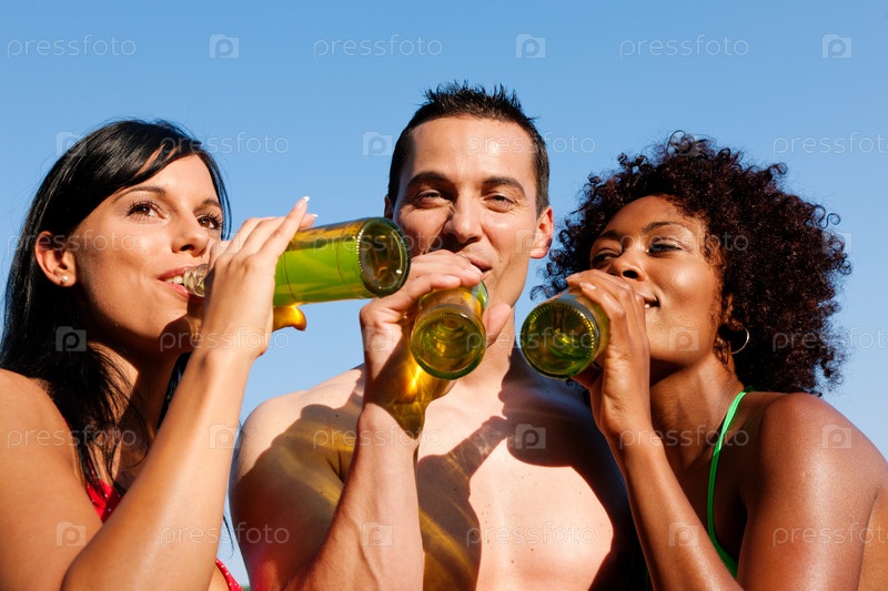 Трое друзей пьют пиво на фоне синего неба