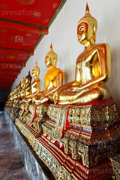 Золотые статуи Будды в ряду в Ват Пхо, Бангкок, Таиланд