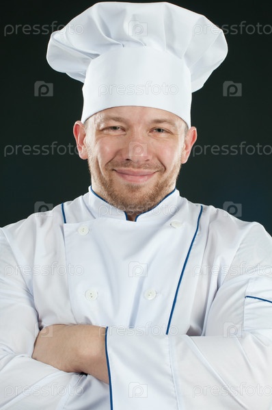 Улыбающийся шеф-повар в униформе, темный фон