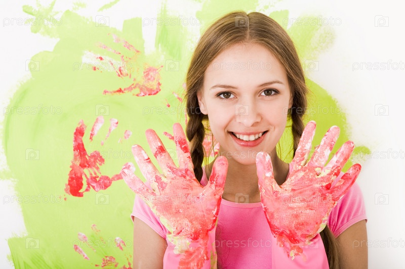 Изображение радостной девушки, показывающей руки в резиновых перчатках и улыбающейся на камеру