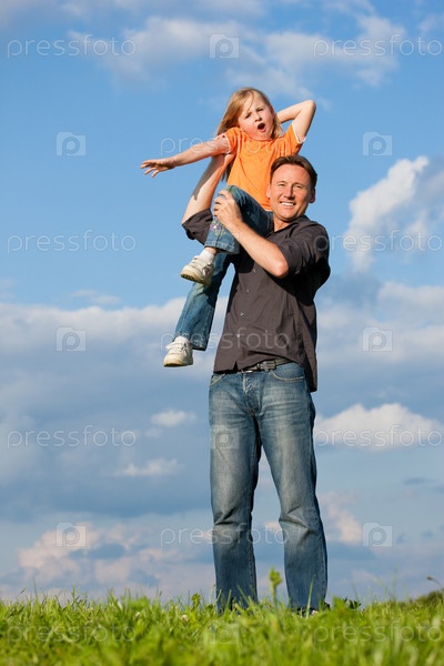 Отец держит на плече свою дочь на фоне травы и неба