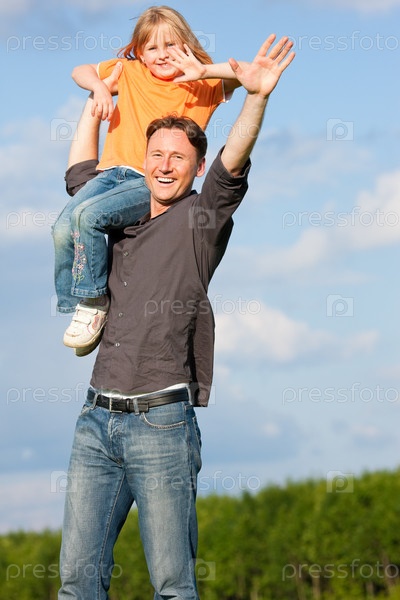 Отец держит на плече свою дочь на фоне травы и неба