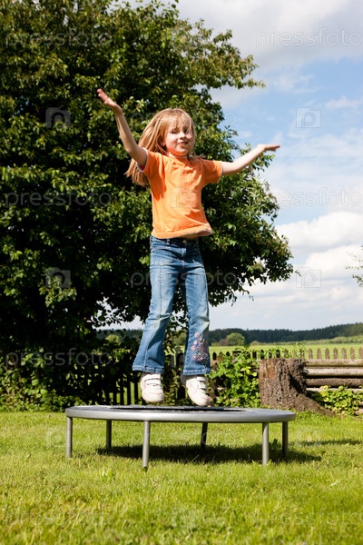 Девочка прыгает на батуте на фоне природы