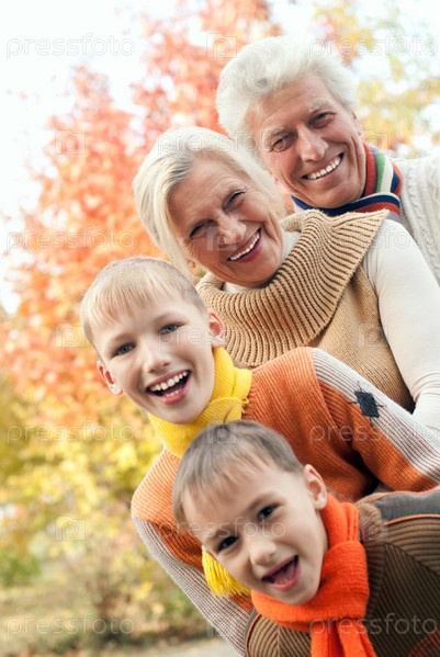 Портрет счастливых бабушки с дедушкой и внуков на природе