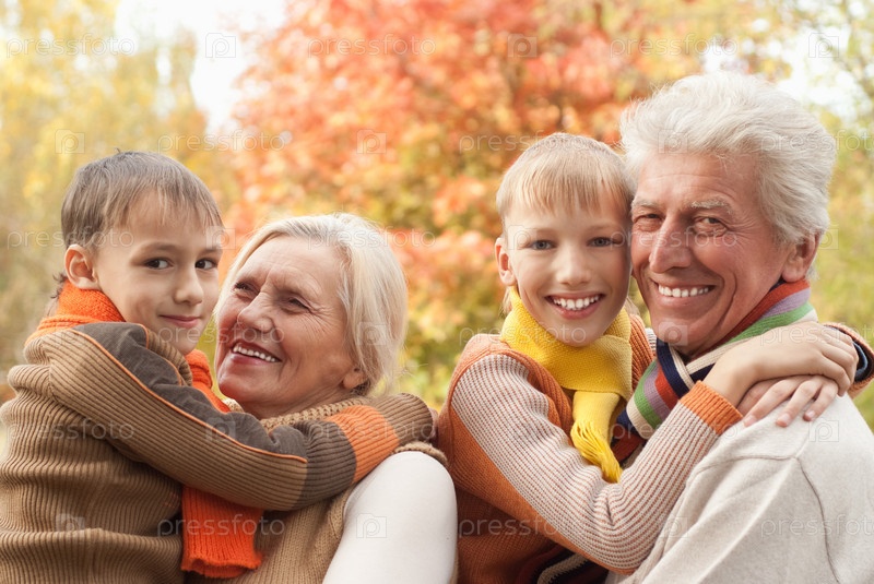 Портрет счастливых бабушки с дедушкой и внуков на природе