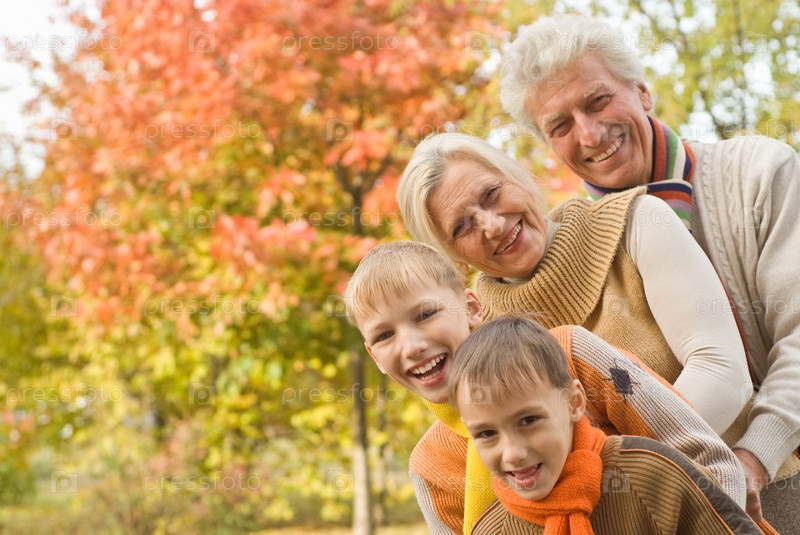 Портрет счастливых бабушки с дедушкой и внуков на природе