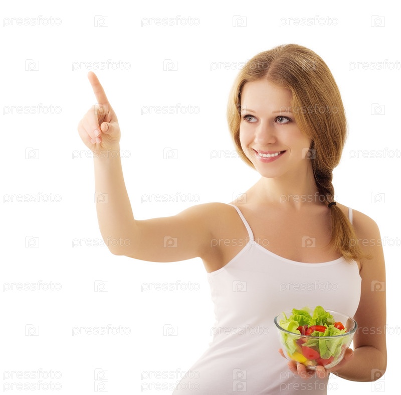Молодая женщина с вегетарианским салатом на белом фоне