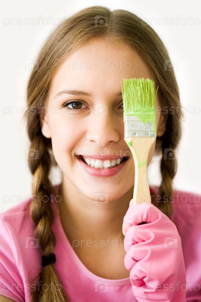 Изображение радостной девушки, скрывающей один из глаз за кистью с зеленым цветом