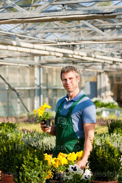 Молодой человек в цветочной оранжерее
