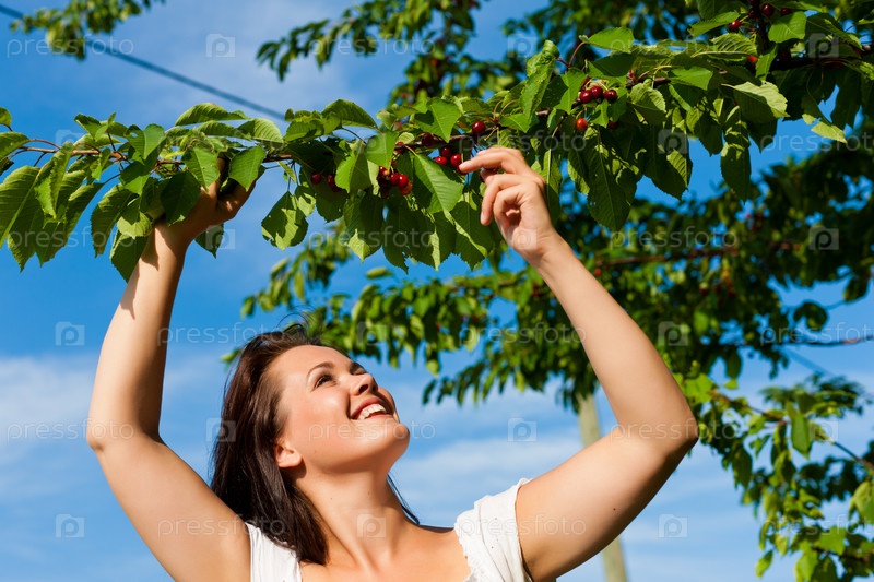 Девушка срывает ягоды с дерева