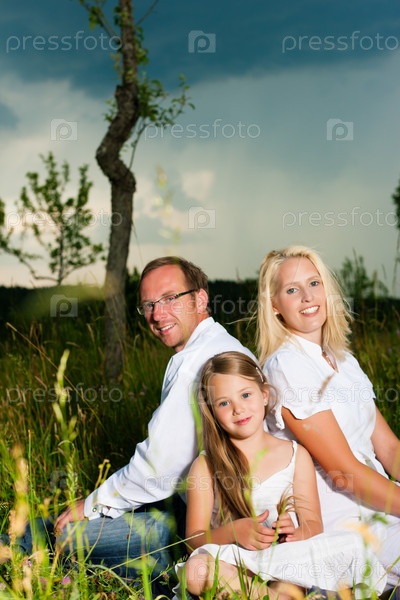 Счастливая семья из трех человек сидит на зеленой поляне на фоне пасмурного неба
