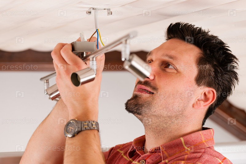 Мужчина вешает лампы на потолок
