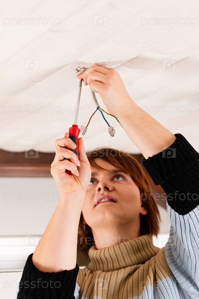 Женщина работает с проводами на потолоке