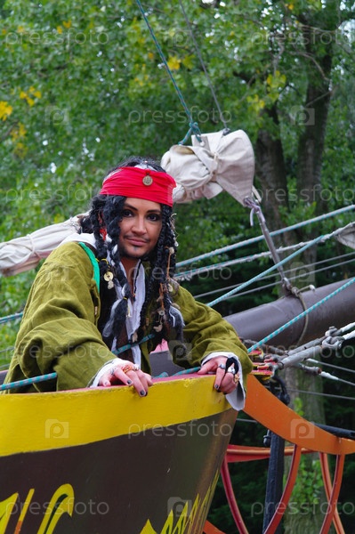 Актер в образе Джека Воробья на парусном корабле у берега