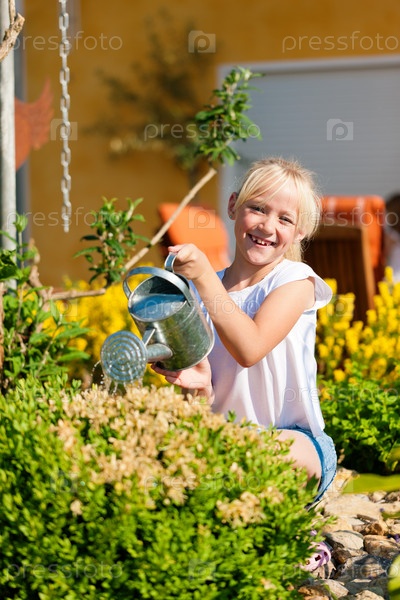 Девочка поливает лейкой в саду