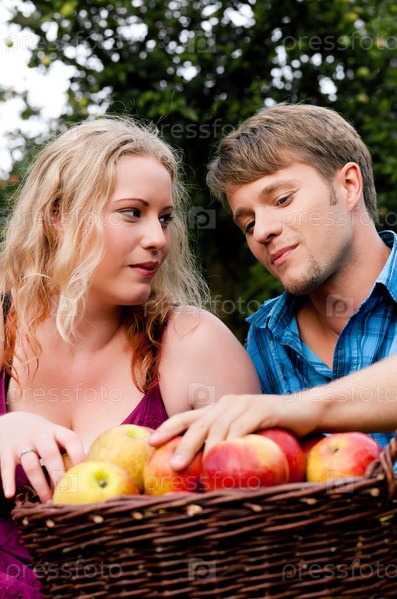 Мужчина и женщина у корзины с яблоками