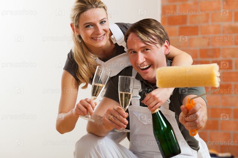 Веселые мужчина и женщина в в спецодежде с бокалами шампанского в руках