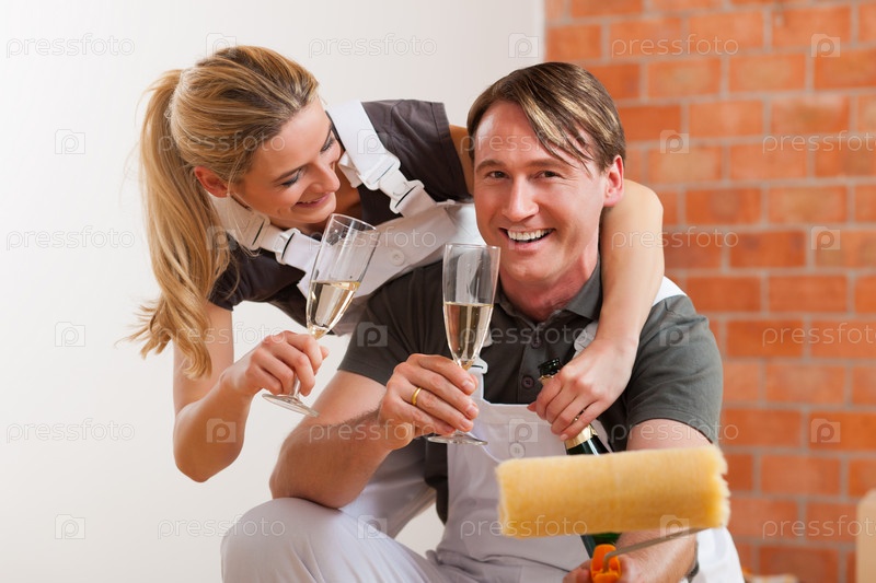 Веселые мужчина и женщина в в спецодежде с бокалами шампанского в руках