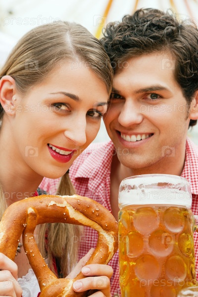Парень и девушка со стаканом пива и рогаликом в руках
