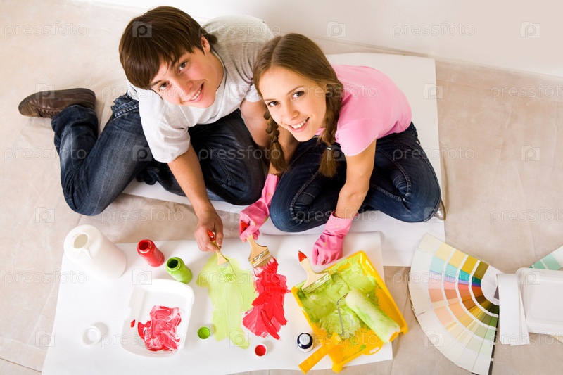 Сверху вид счастливой пары, смешивающей краски, сидя на полу в новой квартире
