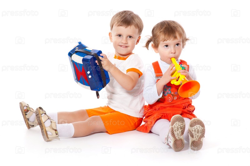 Мальчик и девочка с игрушечными музыкальными инструментами сидят на белом фоне