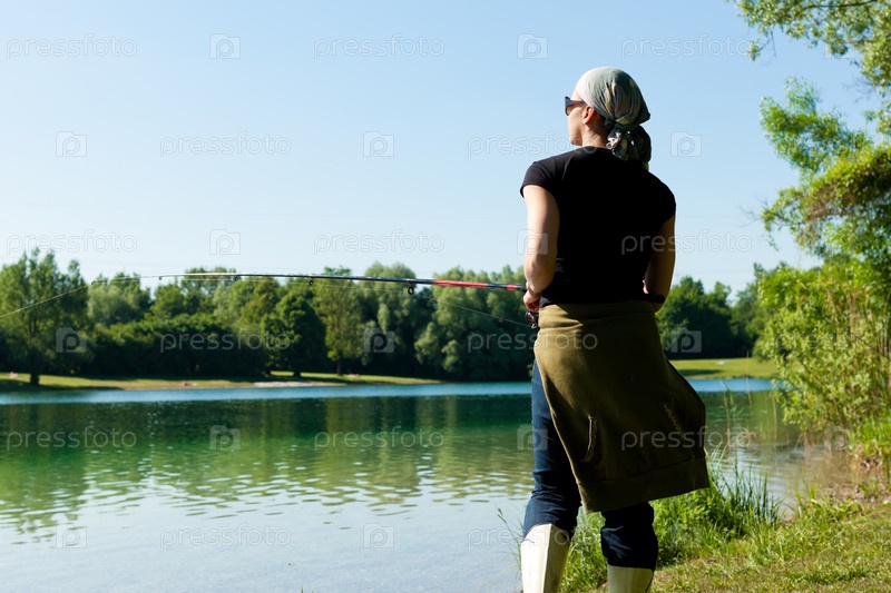 Женщина стоит с удочкой на берегу