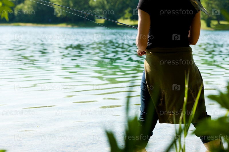 Женщина стоит с удочкой на берегу