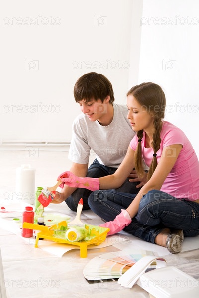 Фото молодой пары, смешивающей краски, сидящей на полу в новой квартире