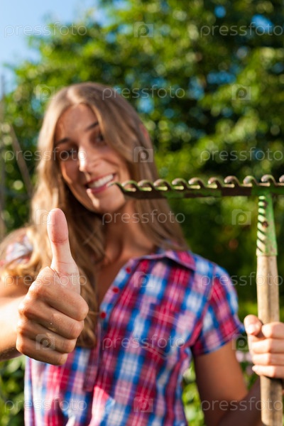 Молодая девушка в клетчатой рубашке и граблями в руке показывает жест "супер"