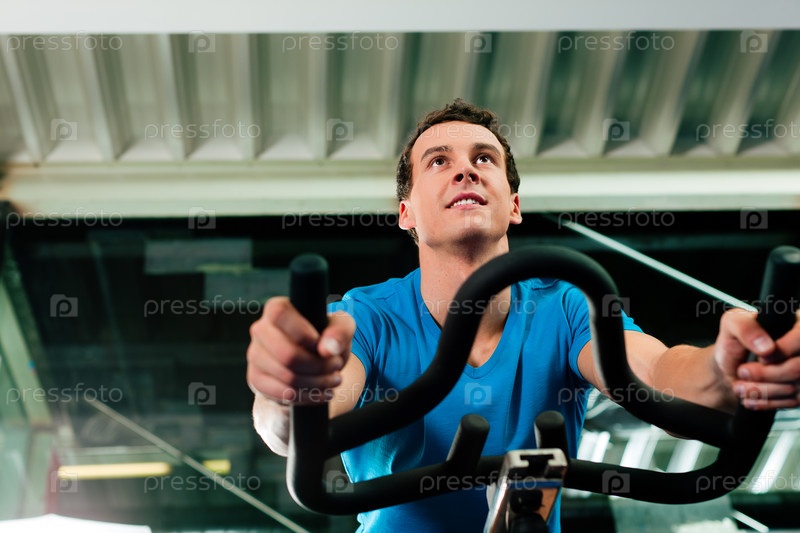 Молодой мужчина занимается на велотренажере