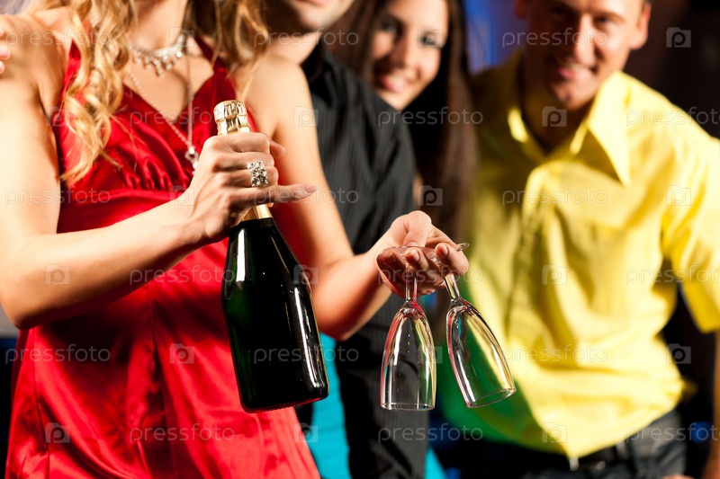 Друзья в бутылкой шампанского в баре
