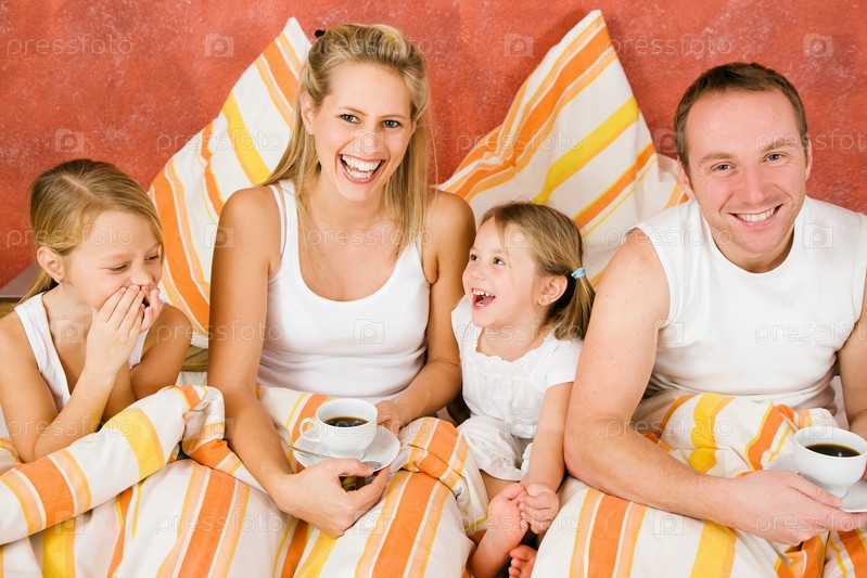 Родители и дети утром в постели с чашками кофе