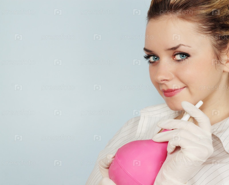 Девушка в перчатках с клизмой на светло-голубом фоне