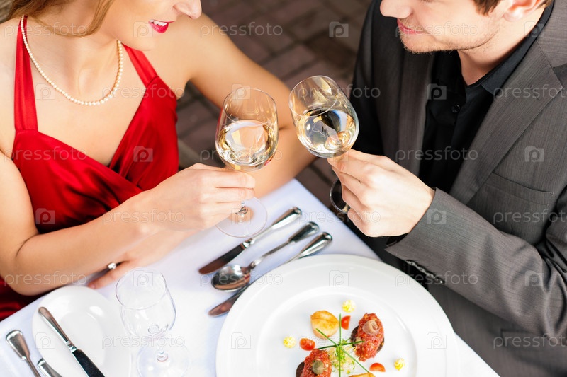 Пара пьет белое вино за столиком в ресторане
