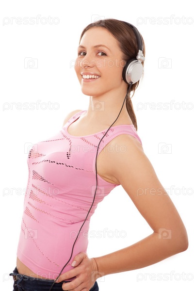 Довольная девушка слушает музыку в наушниках
