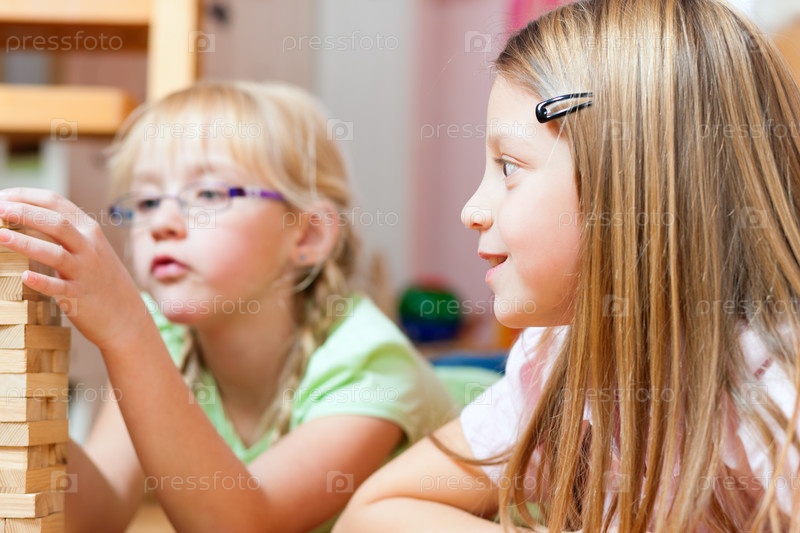 Девочки строят башню из деревянных кирпичиков