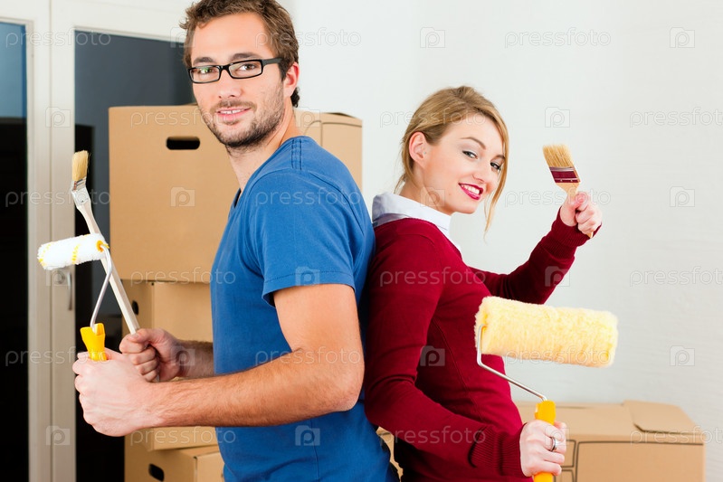 Семейная пара позирует с валиками и кисточками для красок