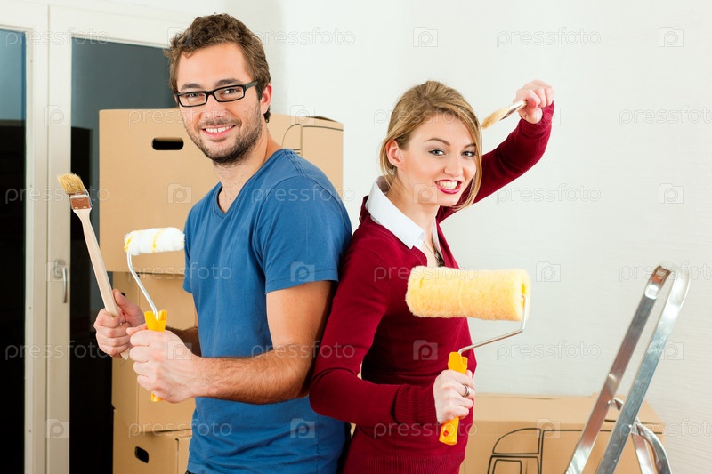 Семейная пара позирует с валиками и кисточками для красок