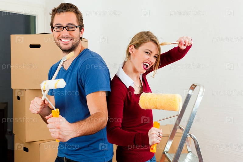 Семейная пара позирует с валиками и кисточками для красок