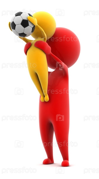 Красный человечек держит на руках желтого человечка с футбольным мячом, белый фон