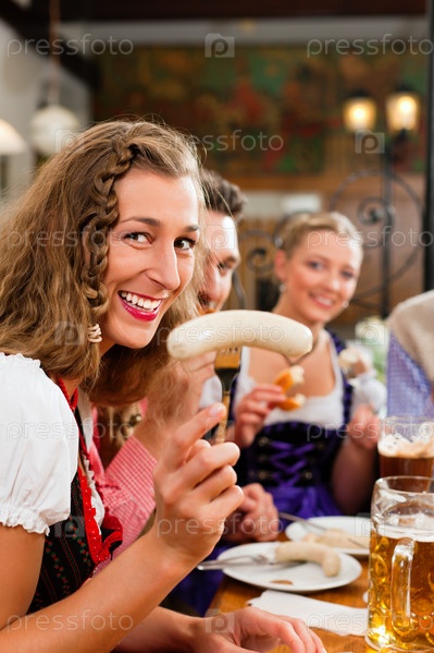 Компания друзей пьет пиво и есть сосиски в баре
