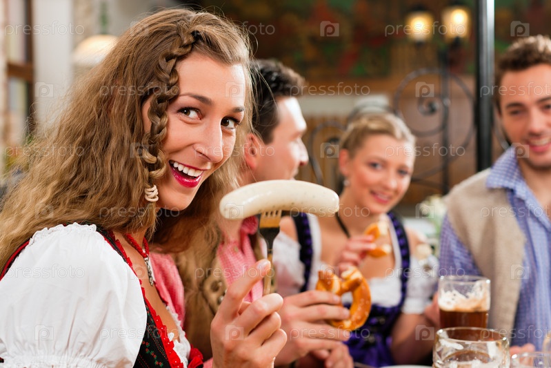Компания друзей пьет пиво и есть сосиски в баре