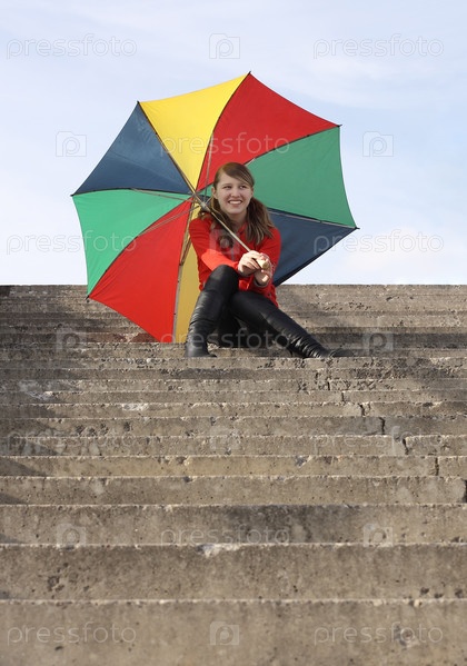 Улыбающаяся девушка с зонтиком сидит на ступеньках